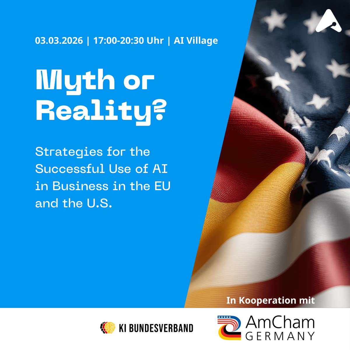 The American Chamber of Commerce in Germany e.V., KI Bundesverband, and AI Village are delighted to invite you to an upcoming event cooperation on the topic „Myth or Reality? – Strategies for the Successful Use of AI in Business in the EU and the U.S.“